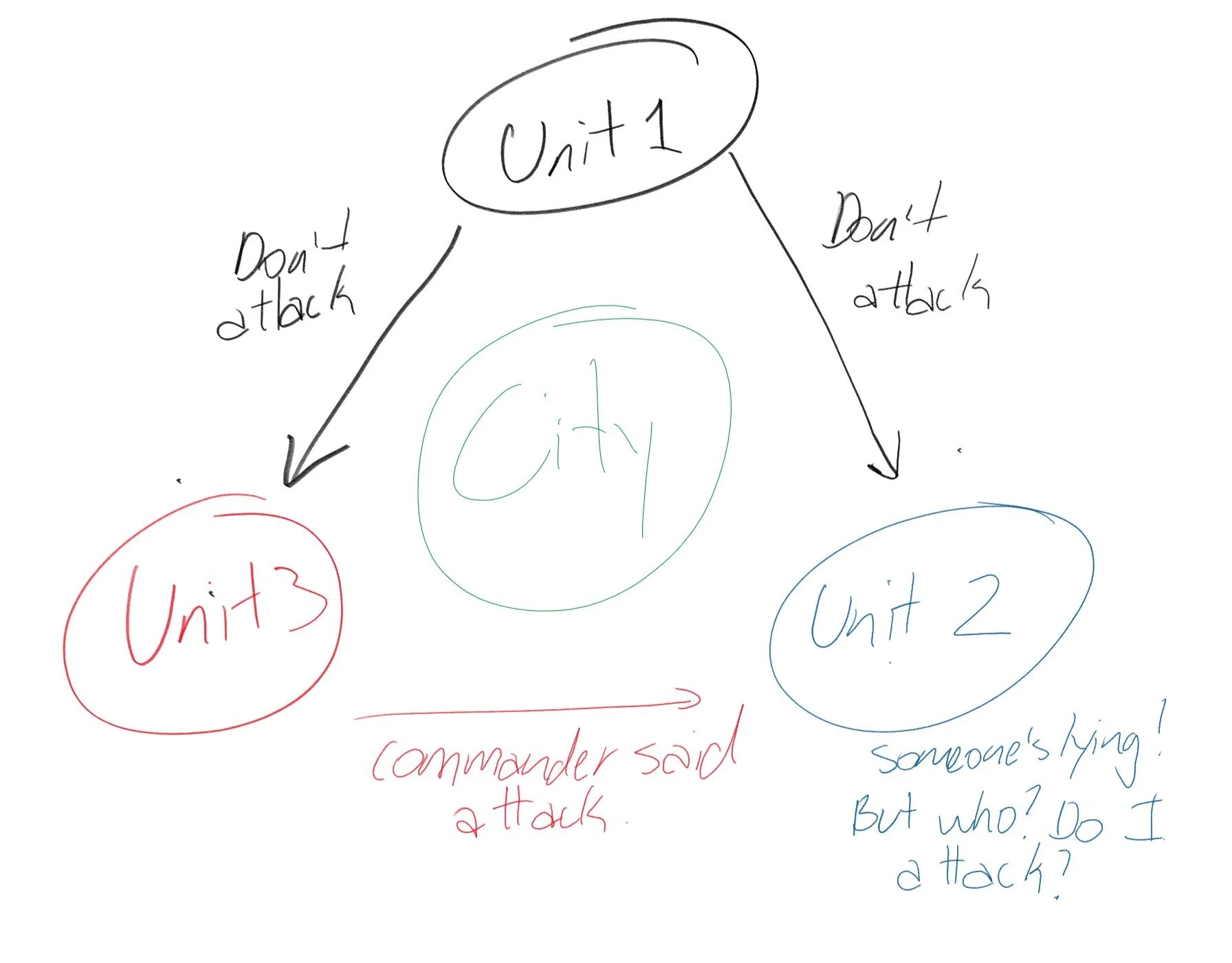 Classically, the problem goes like this: the Byzantine army is about to invade a city the next morning. They have the city surrounded on all sides by their army units. This city is tough though- surrounded by a big wall and with good defenses. The units all need to coordinate and plan to attack all at once or else they will be defeated. The problem is this: how can the commander message all the units so they are all either in agreement to attack or to fall back? The messengers will need to go through tough terrain and enemies, and some may not make it. He cannot risk attacking without being sure that everyone else will. How does he does he do it?